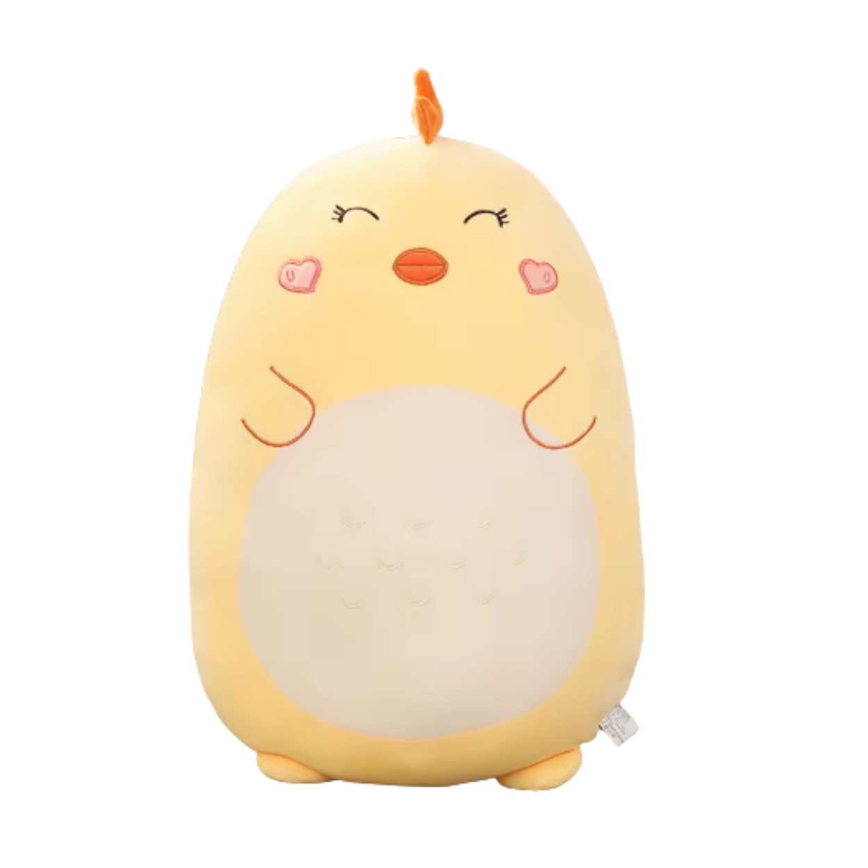 Con i suoi occhi chiusi dalla gioia eccessiva, il becco pronto a fare “cuiiiiic” in ogni momento, e le guance a forma di cuore cucite con amore cieco, vive in un universo parallelo dove tutto va benissimo.